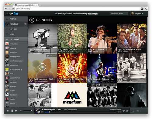 Exfm was built to be a social music application as well, and the service had previously given users the ability to tag the songs they’re listening to and share those with their friends, view a feed on songs from the people you follow on exfm and social networks, and more. This functionality remains, but with its new web platform, exfm has added an “Explore” section, which lets users access the so-called “Tastemakers” feed as well as a “Monthly Mixtape” to see what the experts are listening to and recommending, and visit sites of the day. Sites like Spinner, MTV Hive, and I Guess I’m Floating, for example, provide expert tastemaker musical recommendations.