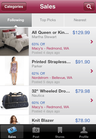 Nadkarni says he had the idea for the service after he took some time off from Livemocha, and found that his wife was having trouble locating nearby sales on mobile. So many apps were focused on price comparisons and barcode scanning (ShopSavvy, Red Laser), standalone check-ins (Foursquare) or promotions (ShopKick, Groupon), but there wasn’t a simple way to just browse local sales and search for items.