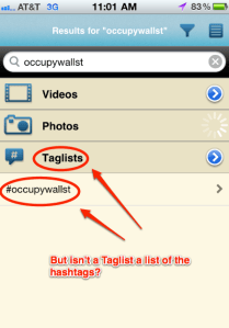 The idea itself is not a bad one – turning Twitter hashtags into a playlist. But the app itself, like the pitch, needs work. In tests, I found things were slow to load and the interface confusing. (Why does the Timeline include some non-hashtagged items, for example? Why does the hashtag show up underneath the “taglist” in some search results? Aren’t they the same thing? See photo to right.) Frankly, the app’s design wasn’t all that appealing, either.