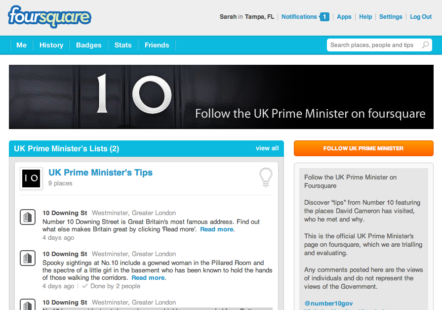 Meanwhile, on Foursquare, the PM will check-in to various venues in order to “illustrate the events the Prime Minister participates in during his day-to-day duties beyond Downing Street.”