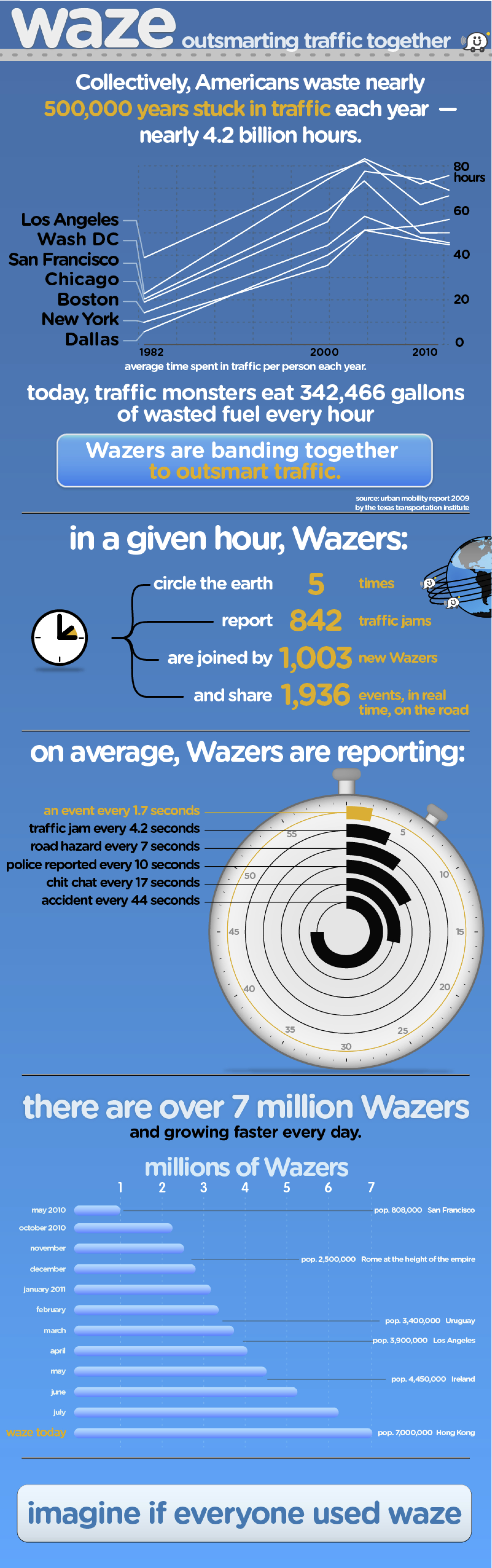 The apps rely on crowdsourced data, from driver-created maps, to citizen traffic reports, to community-curated points of interest. On average, Waze users are reporting a traffic jam every 4.2 second, and an accident every 44 seconds. With millions of users, that’s a massive amount of data.