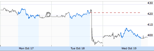 Apple’s stock dropped 23.62 points today — over 5.5 percent. It went from an all-time closing high of $422 a share, to under $400 a share. Why? Again, the earnings announced yesterday. For the first time in something like 9 years, Apple failed to beat Wall Street’s expectations.