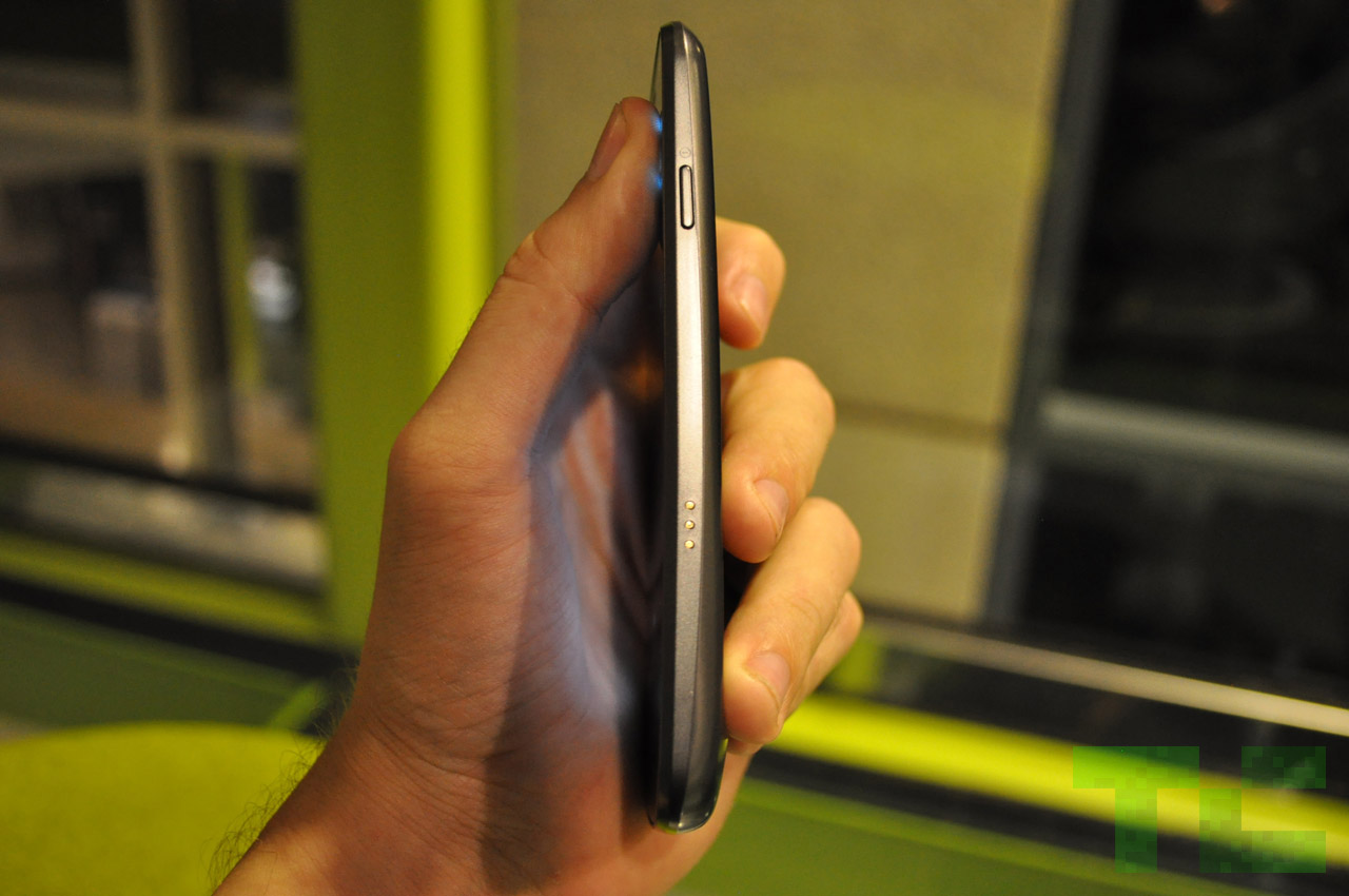 Appearing from the side as something not unlike a teardrop, the Galaxy Nexus tapers from above down into an ever-so-slightly thicker base. Unlike the “hump” found on the rump of the Motorola Droid X (or even the just announced Droid RAZR), however, Google tells me that the deeper base is designed as such for sake of ergonomics, rather than as a store-all for the device’s thickest components. Also unlike the Droid X, the Galaxy Nexus’ wider bit doesn’t detract from the device’s overall look.