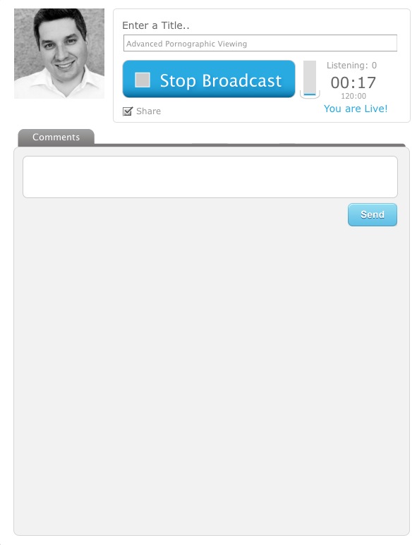 The browser based app (Android and iPhone versions are also available) lets you broadcast live. That’s basically it. You press a button, perform a mic check, and start railing against the Illuminati and the Bilderberg Group. People can listen to you live or they can listen to your previous recordings.