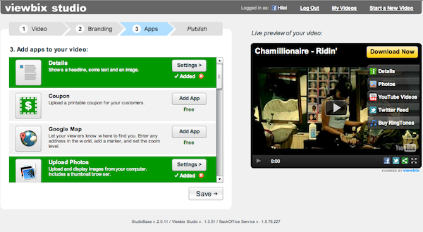 Step three is really where the promise of ViewBix resides: interactive features that can be easily added to videos, including music, additional videos, photos from services such as Facebook, Flickr & Picasa, and more. The ones I found most compelling for a small businesses are the ability to include a Twitter feed, eBay auctions, coupons, and Skype integration.