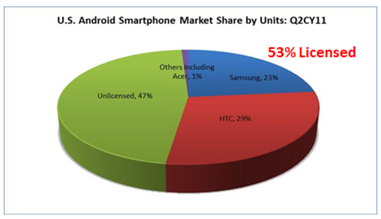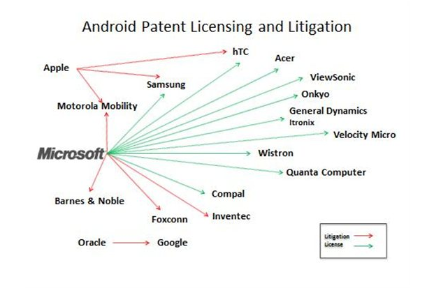 But Microsoft counters that its agreements reduce the number of patent lawsuits, as depicted in the chart below. From Brad Smith and Gutierrez (Smith is Microsoft’s Executive Vice President and General Counsel) write today, As agreements ensure respect and reasonable compensation for Microsoft’s inventions and patent portfolio. Equally important, they enable licensees to make use of our patented innovations on a long-term and stable basis…While lawsuits may dominate many of the headlines, these are being overtaken by the number of license agreements being signed. At this point, the fast pace of licensing is reshaping the legal landscape for smartphone patents.