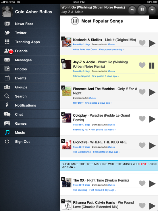 Last night the company rolled out a new version of the iPad app (the 99 cent version is already live, while the free version is pending Apple’s approval).With the new update, Loytr continues to integrate new features that Facebook doesn’t offer — in addition to Twitter integration, it now features a trending apps section, which showcases other applications users have installed to their devices. And the company just did a deal with Hype Machine to integrate free music as well.
