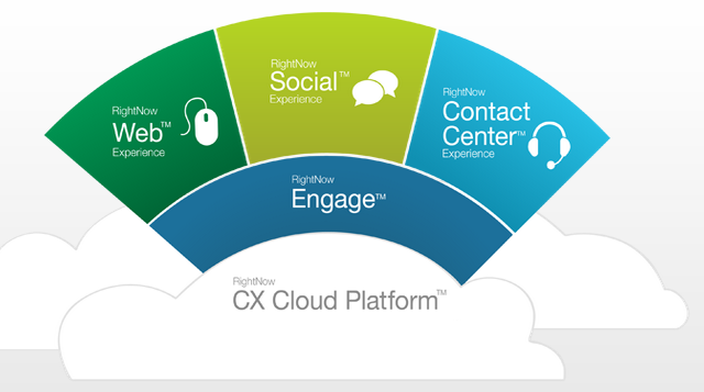 Oracle this morning announced that it has acquired RightNow – both companies are listed on NASDAQ – for $43 per share or roughly $1.5 billion net of RightNow’s cash and debt. With the acquisition, Oracle is adding a robust cloud-based customer service offering (see graph below) to its own Public Cloud solution – more info on that here. RightNow’s share price closed at $35.96 last week, so the deal represents a premium of roughly 20 percent on its closing price on Friday the 21st of October.
