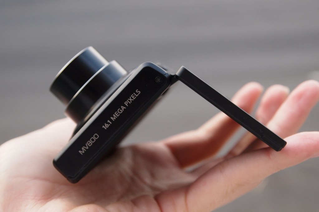 The MV800’s claim to fame is its flip-out 3-inch LCD screen, connected to the device by a single hinge. In my time with it, the hinged screen seemed sturdy enough. I felt a little looseness at one point when the camera was flipped out, but overall I’d say the flip-out screen shouldn’t give you any trouble.