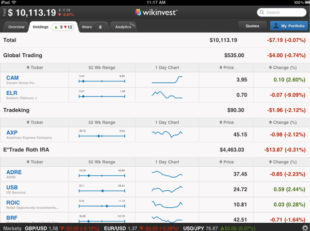 The app has been built from the ground up for iPad to give investors a high-level view of their investments. Through Wikinvest’s proprietary brokerage import technology, users can import their account information from over 60 of the largest brokerage firms in the U.S.