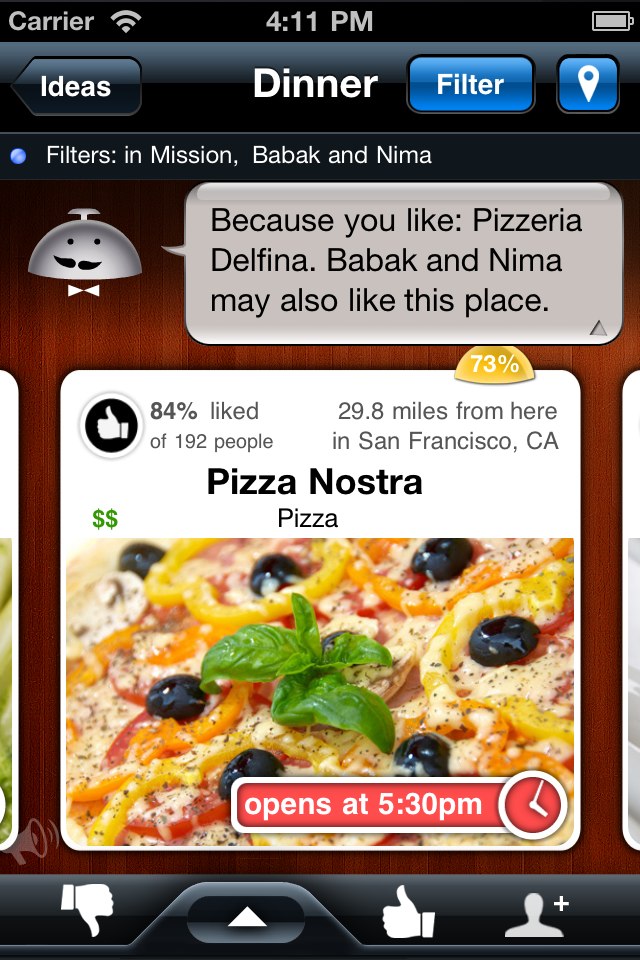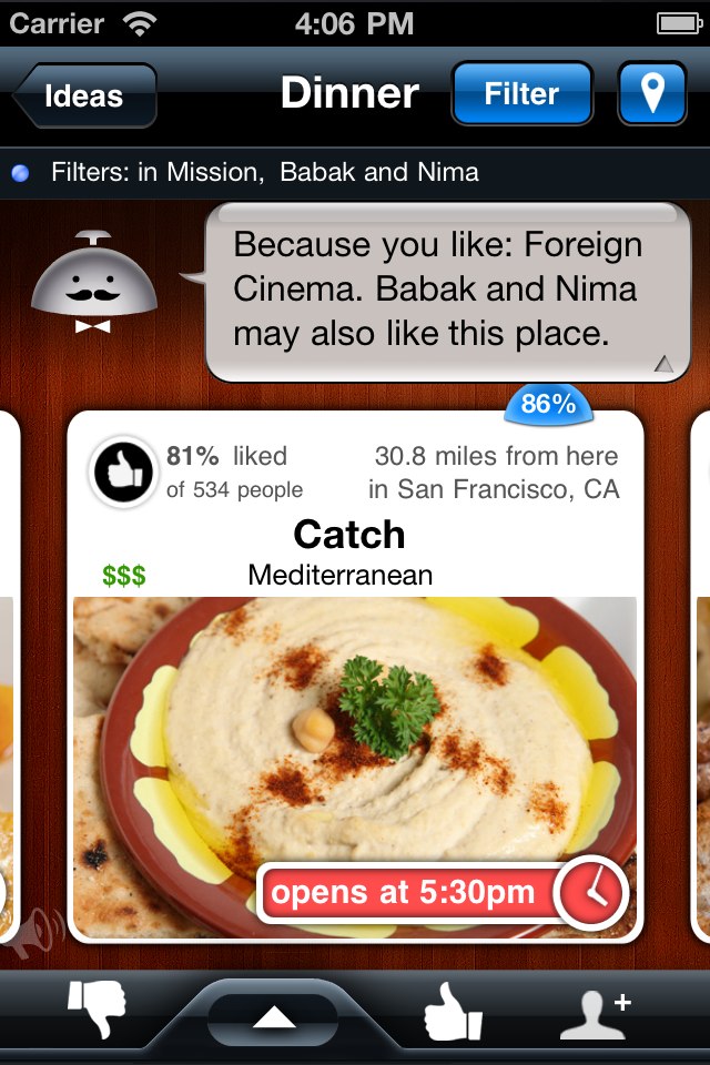 To generate its suggestions, Alfred sorts through hundreds of attributes associated with a given user. According to CEO Babak Pahlavan, each user has, on average, 200 of these “tags” that help Alfred understand a person’s individual interests. And this is in addition to an average of 24 explicit “likes” on Alfred itself. When combining and comparing these tags from one user with another, you’re now talking about thousands of data points Alfred has to consider. The breakthrough here is that Alfred can do exactly this, even for groups larger than two, with minimal impact to the performance of its recommendations engine.