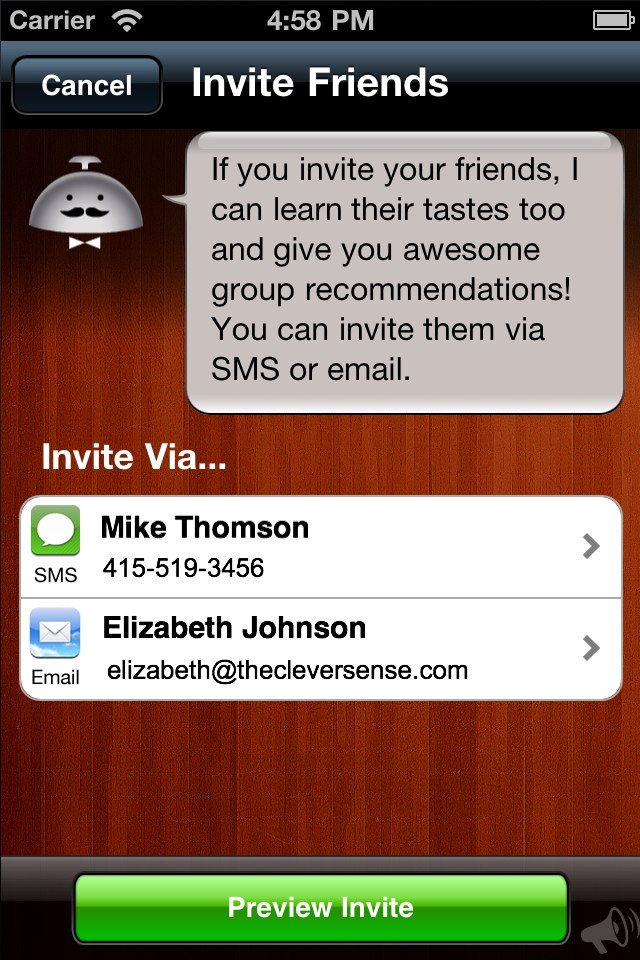 The group recommendations feature, however, only works if your friends are also Alfred users. To encourage your friends to try the app, so you both can use the new feature, the app now suggests you send them a text or email invite.