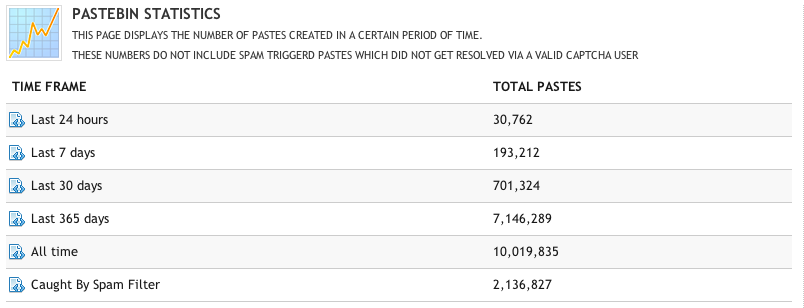 It took 8 years for Pastebin.com (which, for the unassociated, is sort of like the Internet’s clipboard. Anyone can paste in a big ol’ wall of text and share it with anyone else, often anonymously) to reach 1 million “active” (read: not spam or expired) pastes. In the year and a half since, it’s spiked all the way up to 10 million.