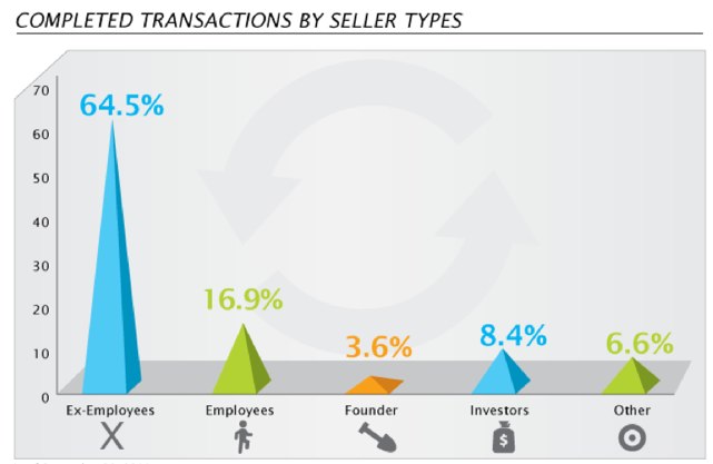 On the seller’s side, former employees made up the bulk of completed transactions (64.5 percent). But current employees took the No.2 spot with 16.9 percent of transactions , nearly quadruple the 4.4 percent of transactions they represented in the second quarter. The number of transactions with investors selling doubled to 8.4 percent, signaling that secondary markets are becoming a more accepted liquidity valve for current employes and shareholders. Founders represented the smallest amount of transactions, at 3.6 percent, but that is up from 1.9 percent last quarter.