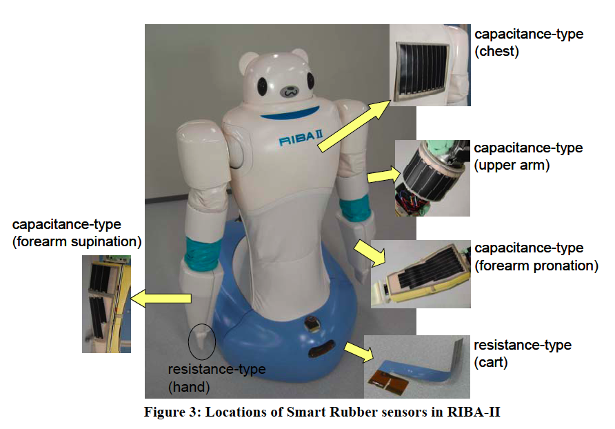 RIBA II is able to “gently” lift people (weighing up to 80kg) off the floor and onto a bed, freeing human caretakers of this hard task. His makers say they designed the material that patients get in touch with, especially the arms and hands, to be as soft as possible – thanks to the world’s first capacitance touch sensors made of rubber (see below).