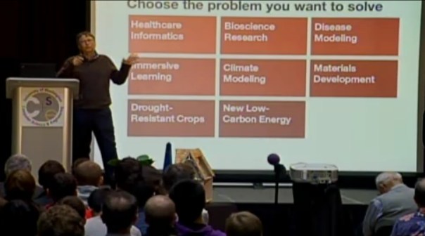 Gates began by establishing his computer science credibility, not that it’s necessary at this point, by reminiscing about the early days of computing. He recalled that at UW, “at strange hours you could essentially break in and steal computer time,” on the batch-work computers of the day like the B5500. This served as a segue, actually, to his initial thesis, which was that people like himself aren’t the ones who will bring be making the next generation of breakthroughs happen.