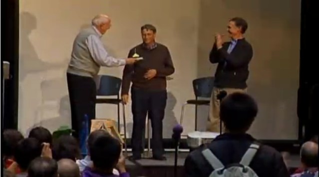 Lastly, the host noted that it would be Bill’s birthday tomorrow (the 28th), and invited Bill Gates Sr. up on stage, who held a cupcake with a candle for the younger Bill to blow out.