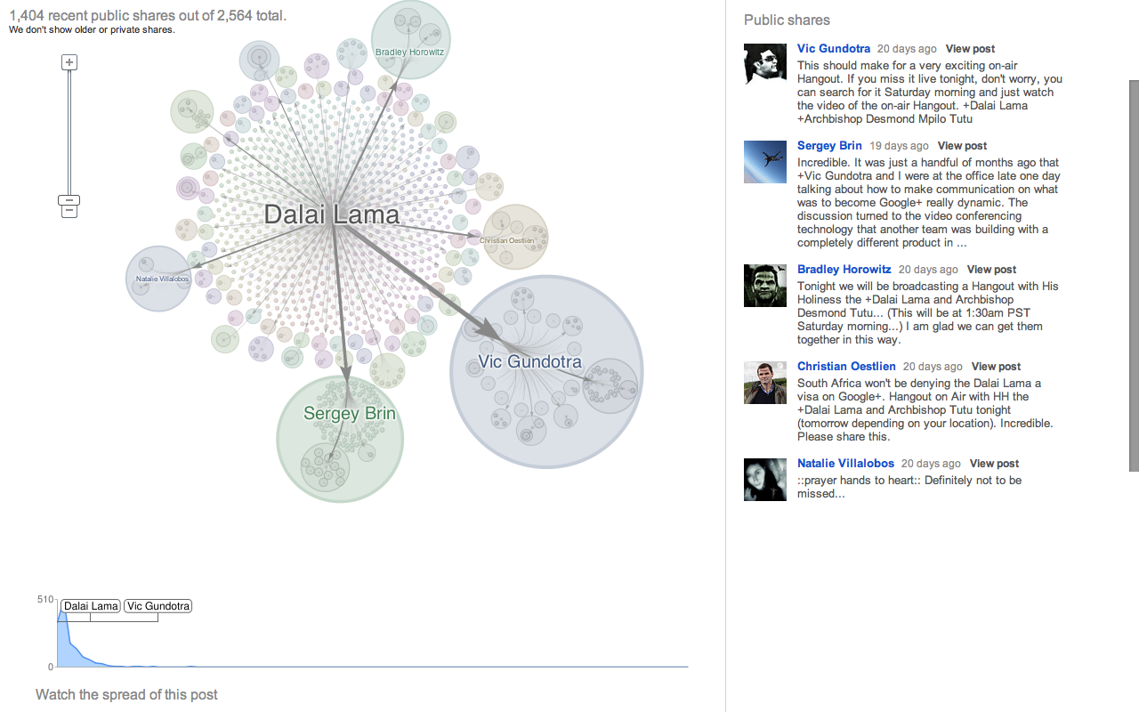 From there, Google+ pops open a new tab, where users can see the activity in a nifty graphical interface, zoom in on particular events — seeing the innerconnectedness of it all. The diagram shows the post spreading across the network as other users share the post, with arrows “indicating the direction of resharing” and the circles within circles representing the “resharing sequence” with the larger circles indicating the heaviest sharing (and sharers), according to the Ripples description.