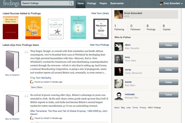 Findings is a pet project of Betaworks CEO John Borthwick and author Steven Johnson. The service lets you share your highlights from Kindle books as well as articles on the web via a bookmarklet. But it is not intended to be a web clipping service. It is really more about reading in the digital age, sharing quotations from books and other writings that resonate with you and making them your own by collecting them into a feed. In many ways it harkens back to an earlier form of reading hundreds of years ago when Englishmen would hand-assemble their own collections of quotations into a “commonplace book.” The notions of reading and writing were intertwined, borrowing passages from others and making them your own was part of the process, as Robert Danton notes in The Case For Books: