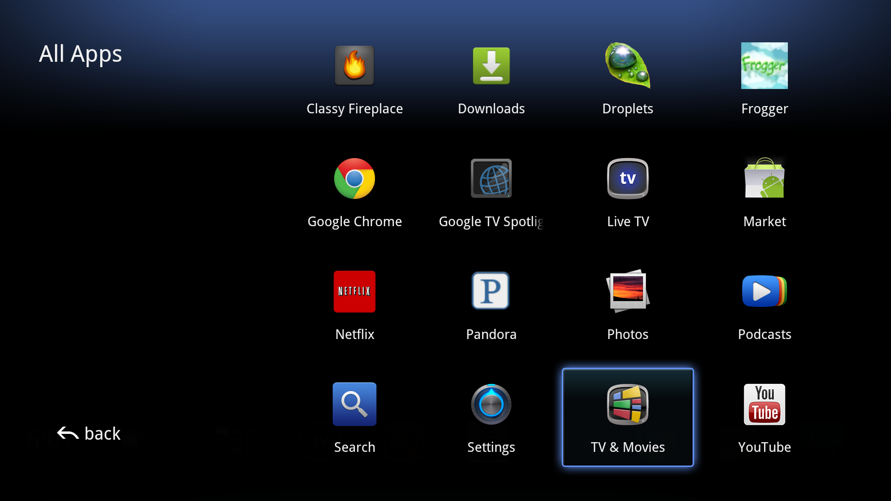 Android Market was missing from the product since launch and is part of the latest update. The Market will only feature Android apps that can actually work on a TV and do not require specific hardware like a touchscreen. 30 apps out of the 800 launching will be featured including CNBC, Fox News Business, Zillow, and Aol HD — so, you know, apps you probably won’t use. Mario indicated to me that HTML 5 Google TV apps are not segregated from standard Android apps since to the user, they’re still apps. Smart.