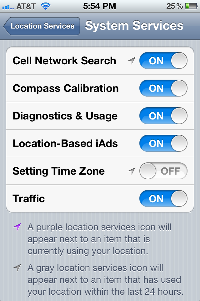 The Time Zone bug, however, seems to be solved (although again, by disabling things). Oliver Haslam over at iDownloadBlog noticed, like many of us, that iOS 5 was sucking his iPhone 4 battery dry. He realized that by going into Settings > Location Services > System Services (all the way at the bottom) > Setting Time Zone, and toggling off the location services, his battery life nearly doubled. According to Haslam, iOS 5 probably has a bug that constantly pings the servers to update location, and thus update time zone settings.