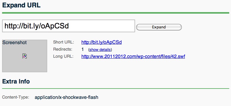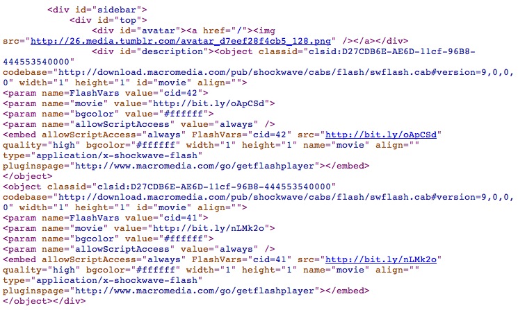 Even more importantly, perhaps, is that spammers on Tumblr aren’t just using the platform to build backlinks – it some cases, their Tumblr profiles even contain a payload, like a link to a malicious piece of malware. Here’s one example, uncovered by shortformblog, who found bit.ly links hidden in the source code of a suspect Tumblr profile which pointed to a rogue Flash file download.