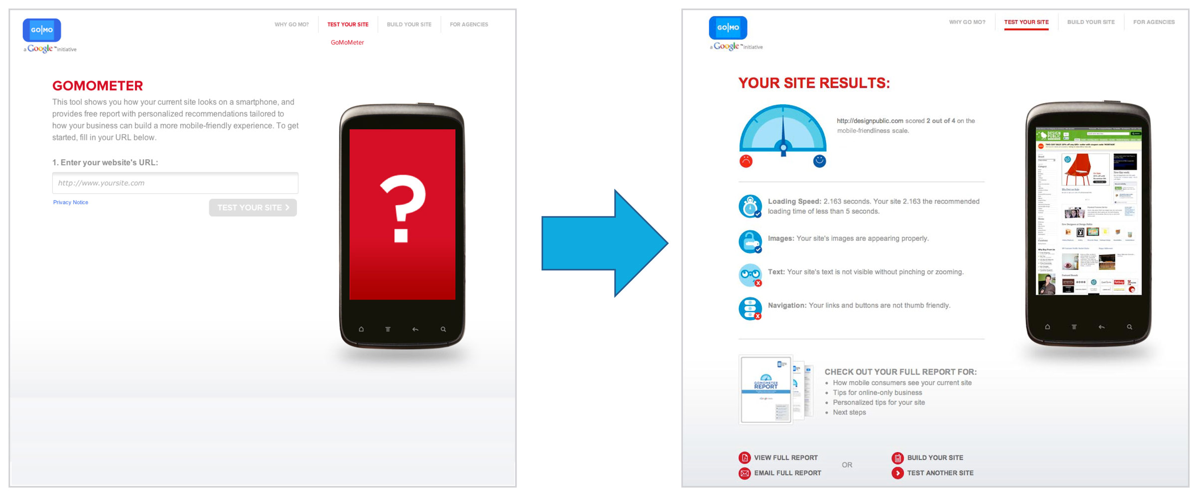 On HowToGoMo.com, business owners can enter in their current website’s URL to see what the site looks like on mobile. GoMo will then make suggestions and recommendations on how the site could be mobile-optimized. GoMo will also show examples of great mobile websites for inspiration and point to a list of mobile site developers who can help design a better experience.