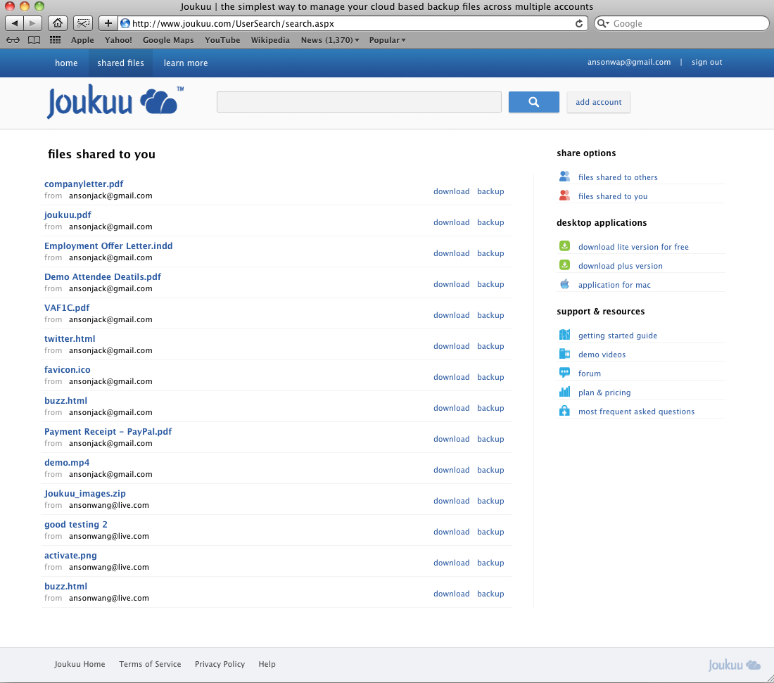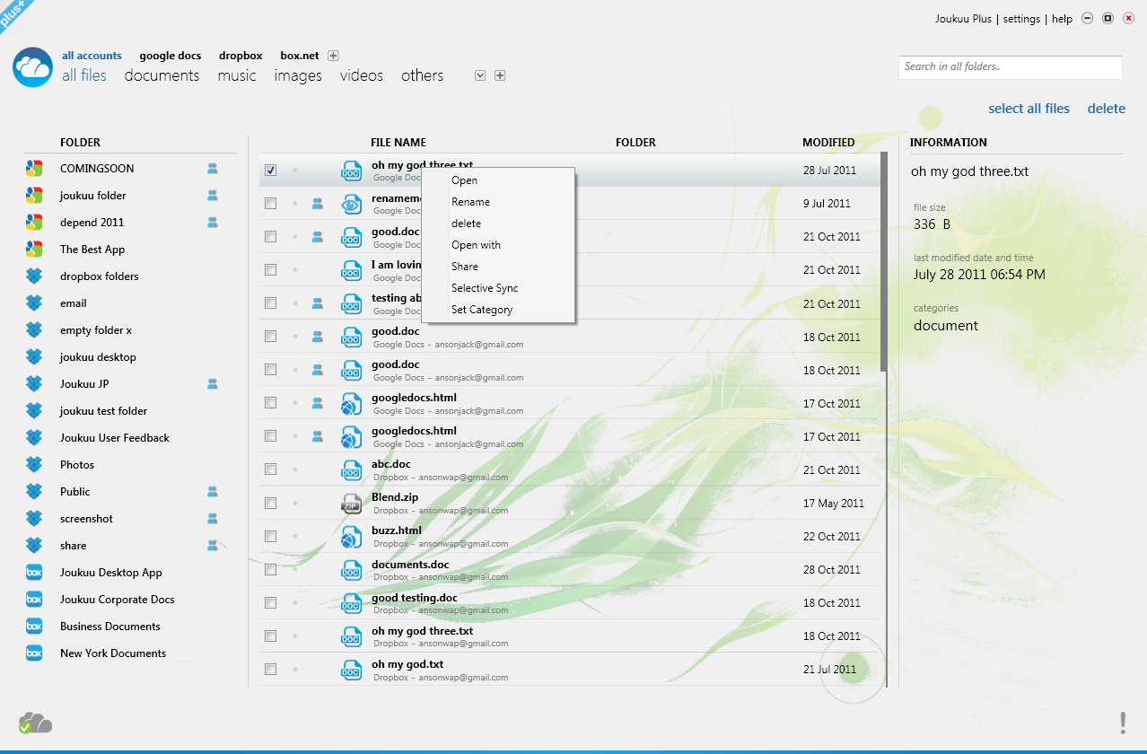 After adding accounts, Joukuu automatically crawls and indexes all files and lets you handle them through a clean UI. You can access all files (and folders) directly through Joukuu Web, share selected items with others across different cloud service providers, or add/delete/duplicate/rename any files and folders. All modifications get synced back to the cloud service in question.