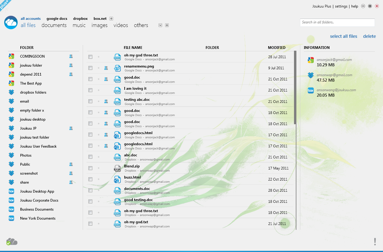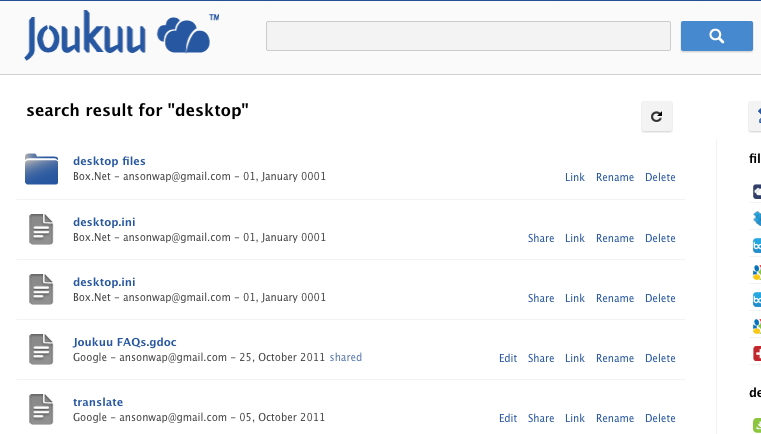 Do you have files scattered over Google Docs, Dropbox and Box.net and look for a way to manage them all using just one platform? Then Jouuku, a file management solution supporting said services, might do the trick for you. The basic idea here is to make it simple to track, edit and share files across multiple cloud storage accounts through a centralized platform, dubbed Joukuu Web. (There is also a Windows-only Joukuu desktop application.)