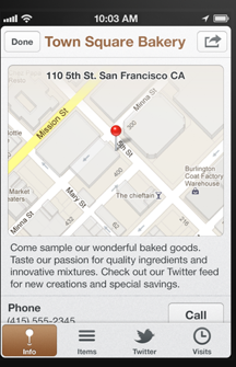With the new version of the card case app, merchants can also add more information on the actual loyalty cards for each business, which Square’s Megan Quinn calls ‘dynamic representations of the business.” While previously you could see the merchants’ names, location, and contact info, Square has added the ability to add menus, photos, click-to-call functionality, directions to the business. Square has also added Twitter integration to link their Twitter account and Tweets, see comments and reviews from customers.