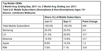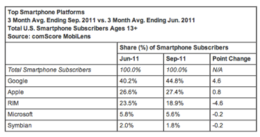 ComScore just released its U.S. mobile subscriber numbers for the three-month average period ending September 2011. According to the report, 87.4 million people in the U.S. owned smartphones during the three months ending in September, up 12 percent from the preceding three-month period.