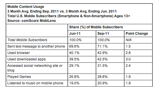 In September, 71.1 percent of U.S. mobile subscribers used text messaging on their mobile device, up 1.5 percentage points. Accessing social networking sites or blogs via mobile phones increased 2.4 percentage points to 31.5 percent of mobile subscribers. And mobile game-playing was up by 1.9 percentage points to take 28.8 percent of the mobile audience, while 20.9 percent listened to music on their phones (up 1.9 percentage points).