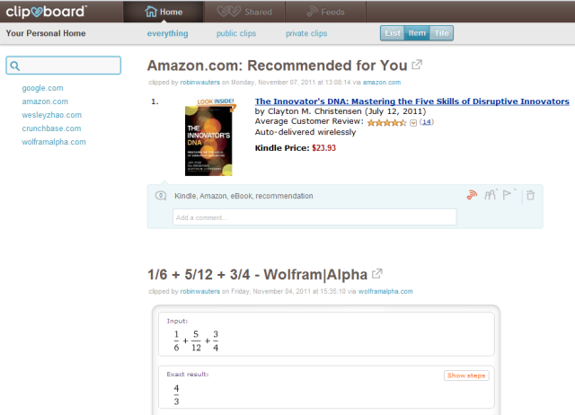 Using a bookmarklet, Clipboard users can ‘clip’ things like search query results, stock quotes, tweets or Facebook status updates, video clips, images with captions, a Google Maps map, a forum answer, an Amazon book review, an eBay product summary, a digital coupon, and the likes.
