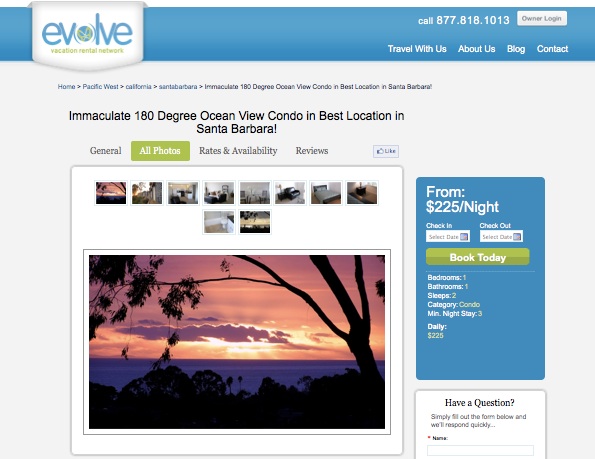 In addition to pushing the listings out to as many vacation rental websites as makes sense, Evolve makes sure the copy reads well and is SEO-friendly, responds promptly to any inquiries, takes payment, and eliminates faxing with online rental agreements. It doesn’t provide on-the ground services such as house cleaning or maintenance, but will help homeowners contract those out. Evolve focuses on the online marketing, and even tests out different versions of the listings using A/B split testing. (For instance, here is a listing for a condo in Santa Barbara). Very few vacation homeowners have the time or inclination to do all of this by themselves.