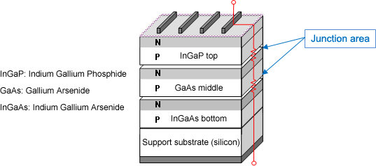 The new 1cm2 solar cell consists of three layers made of indium gallium phosphide, gallium arsenide and indium gallium arsenide (see below). Sharp says it was able to increase the conversion efficiency by using new materials and reducing the resistance of the junctions connecting the layers.