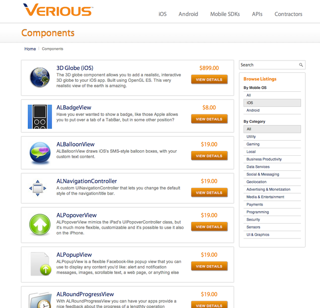 Verious is entering an increasingly crowded market with its mobile component marketplace, where competitors now include Chupa, Appcelerator’s Open Mobile Marketplace and Binpress, to name just a few. Each outlet attempts to differentiate itself from the others through the platforms supported, the size of the listings on the site, their feature set, or some other factor. For Verious, it appears to be going after the “one-stop shop” label, with these recent moves which sees it not only listing mobile app components, but offering services associated with app building as well.