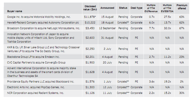 The top deals for the quarter included Google’s $12.5 billion Motorola acquisition, HP’s $10.2 billion acquisition of Autonomy, Broadcom’s $3.5 billon buy of NetLogic, Innovation Network’s $2.6 billion purchase of mobile display units from Sony, Hitachi and Toshiba; the $2.3 billion takeover of GoDaddy, Providence Equity’s $1.6 billion acquisition of BlackBoard, EA’s $1.3 billion purchase of PopCap and NCR’s $1.1 billion buy of Radiant Systems.