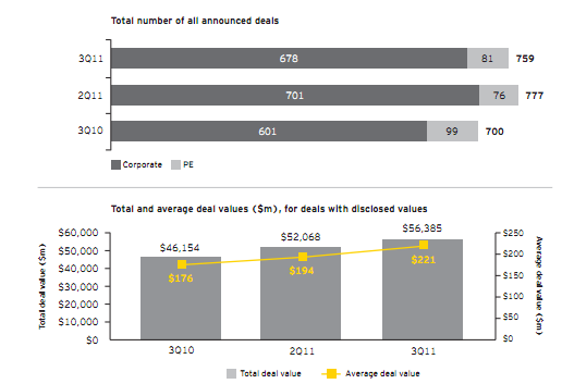 In terms of volume, the number of M&A deals dropped 2 percent for the second consecutive quarter, to 759 deals in third quarter. Cross-border deals declined 11 percent each in volume and value in 3Q11, compared with the second quarter 2011.