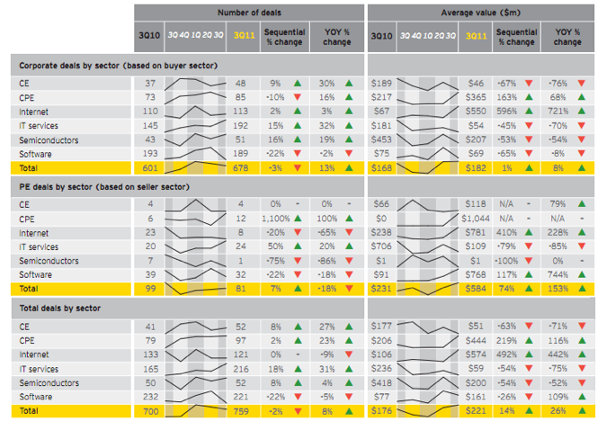 M&A activity in the technology sector continues to grow in terms of value. According to an Ernst & Young report released today, big acquisitions drove the aggregate value of global technology M&A to $56.5 billion in the third quarter of 2011, up 22 percent from a year ago, and up 8 percent from last quarter.