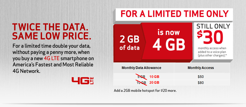 Under the terms of the promotion, customers can pay the regular price for an LTE-friendly data plan and Verizon will give them double the data allotment at no extra charge. The standard smartphone data plan, for example, costs $30 and nets the user 2GB. For a limited time, that same user gets 4GB to use with their 4G device for the same price.