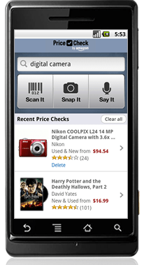 Shoppers use the Price Check app to scan a barcode, snap a picture, or say or type a product name to see prices from Amazon.com’s marketplace and its 2 million online merchants. One exclusive feature to the Android app is the ability to scan in either portrait or landscape mode. The app will display prices sorted from lowest to highest and will also show if the item is available for free shipping.