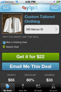 The Yipit app offers a location-based deal map and list view in its “Near Me” section while the “My Deals” section features those deals you would be interested in buying. The app walks you through the personalization process upon first launch, letting you select your city (or cities) from a list, then letting you check or uncheck the deals categories you would like to see.