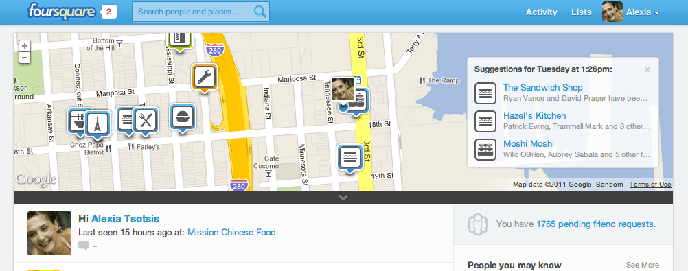 Users visiting Foursquare.com from a computer or a tablet (through the magic of HTML5) will now see a Google map of emblazoned with Icons for all the places of note around them, populated by explore data. Hover over the icons and you get even more data. On your right you can view ever-changing list of Suggested places, which is contingent on time of day.