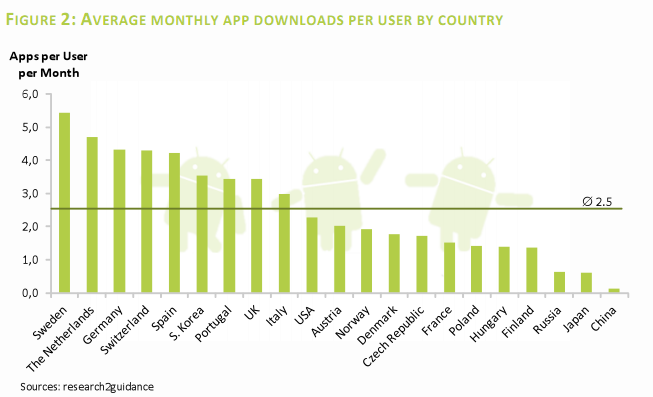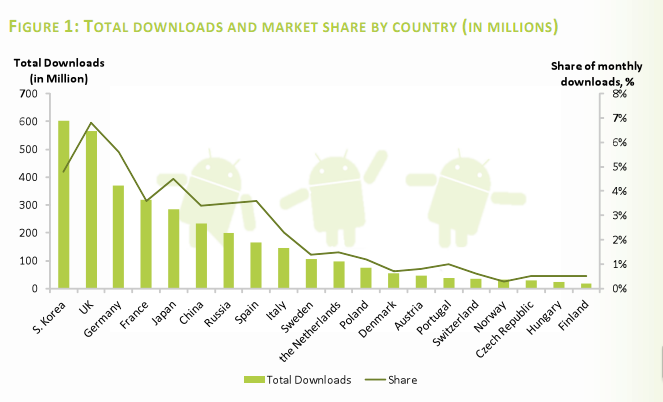 South Korea has relatively high Android smartphone penetration and a high number of app downloads (per user). According to research2guidance Co-founder Markus Pohl, South Korea’s growing share is supported by the country’s extensive IT infrastructure, which not only is known for its high speed and extensive coverage, but also for being fairly inexpensive, around $0.45 per Mbs compared to $11 in the U.K., for example. (South Korea is also home to major OEMs, like Samsung.)