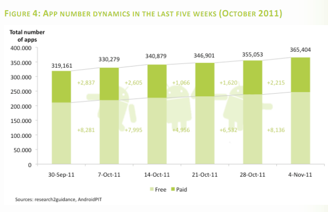 As to apps in the Android market seen as a whole, over the past few months, the report finds, the number of apps has grown “faster than ever”. Every week publishers are releasing 11,000 new apps to the market, compared to an average of 7,500 during the summer. At the end of October, for example, the number of total apps was 365,404 — a growth of over 40K total apps since Robin wrote about the market less than a month ago.