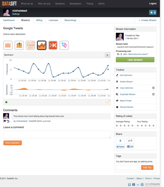 DataSift, a big data business intelligence and analysis platform for Twitter, is finally opening its doors today to the U.S. public. DataSift was born out of Tweetmeme and was announced at TechCrunch Disrupt San Francisco a year ago. Founded by Nick Halstead, DatSift is one of two companies with rights to re-syndicate Twitter’s firehose of more than 250 million Tweets a day (the other one is Gnip).