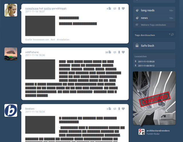 Oh, and if you really want to see your Tumblr Dashboard, try clicking ‘Next Page’ — that seems to make the censor blocks go away.