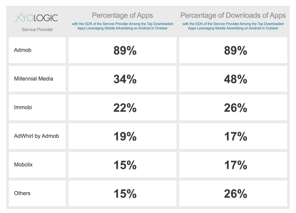 Out of all the ad-supported Android apps, 89% used AdMob, 48% used Millennial Media, 26% used Inmobi, 17% used AdWhirl and 17% used Mobclix.