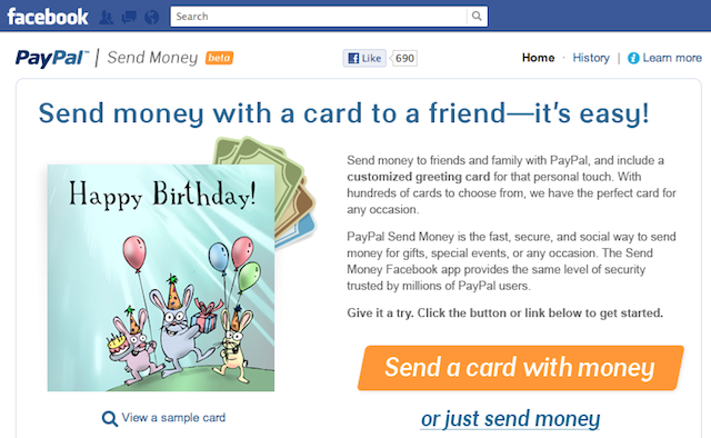 The first incarnation of Send Money was launched in December 2009. It lets you pay friends through a credit card or your PayPal account. What’s new is that you can now also opt to include a digital greeting card, good for sending money on birthdays and other holidays. The only Facebook data the app needs is your friend list, and even then you still have to hunt down a payment recipient’s email address before you can transfer funds. Send Money doesn’t integrate with Facebook’s own payment system, it doesn’t require any secret data or APIs, and I’ve heard it wasn’t even built inside PayPal.