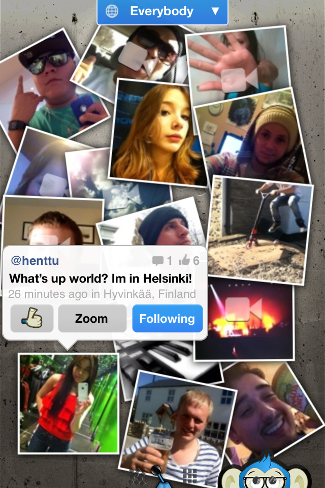 When you find a video (or photo) you want to see, you just tap it, then tap “zoom” and watch. You can also “like” the item or follow its creator by tapping the included “follow” button. The app’s users are given @usernames, like on Twitter. To see just the people you’re following, tap the drop-down box at the top of the screen to switch between “Everybody,” “Following,” “My Profile,” and “Search.”